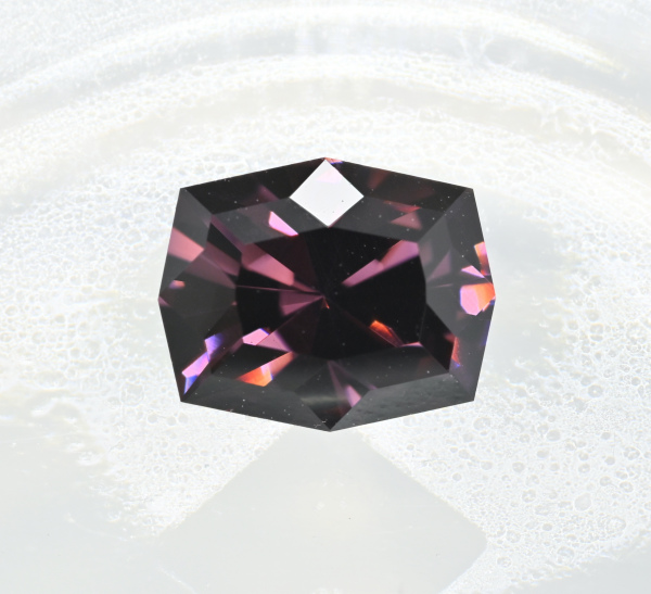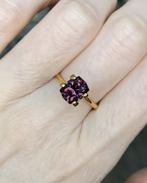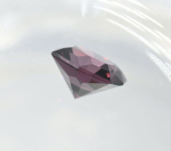 Танзанийская шпинель глубокого пурпурного цвета. Под УФ ярко светится алым (видео на руке). И несмотря на насыщенный цвет, благодаря огранке играет цвтными искрми под лампой